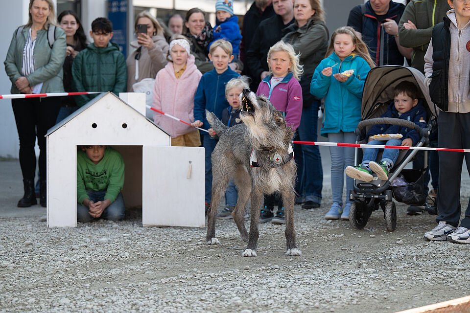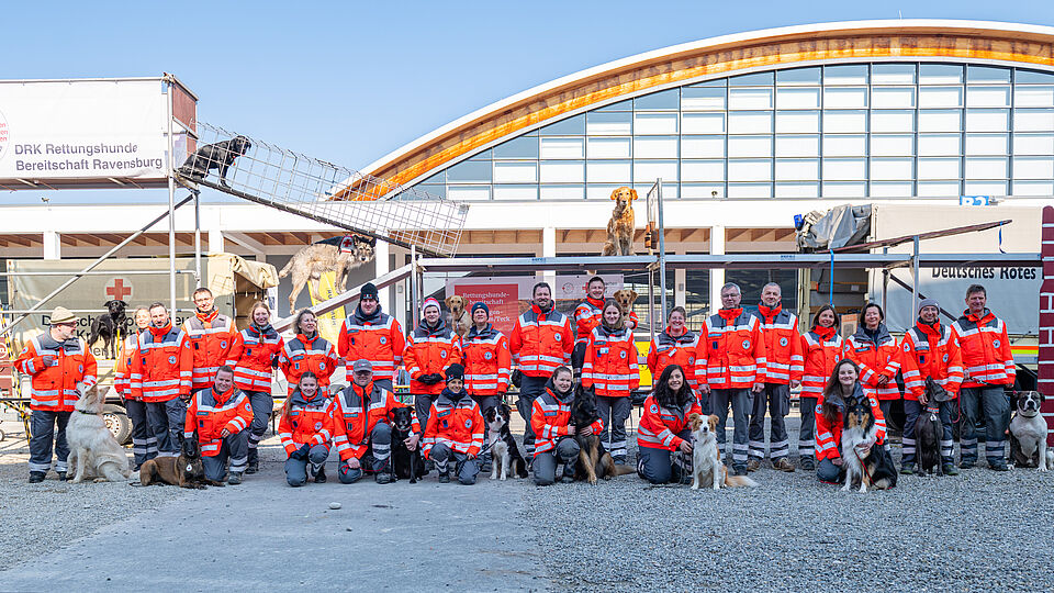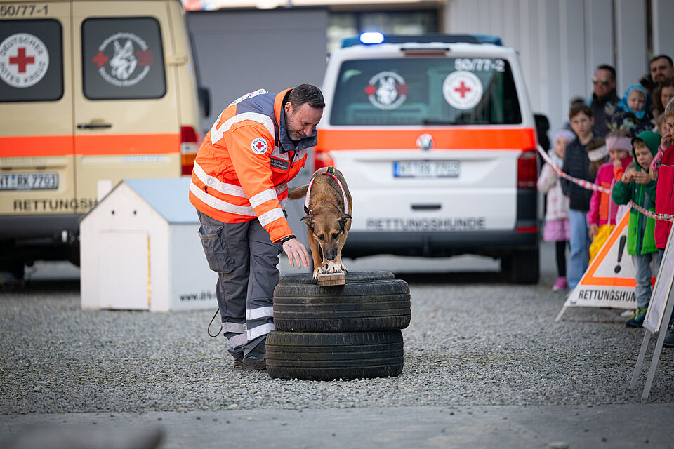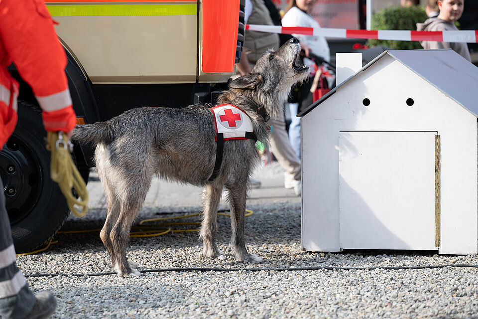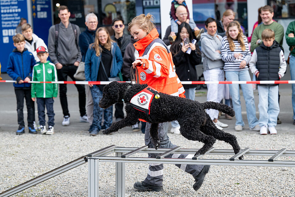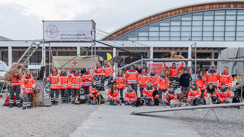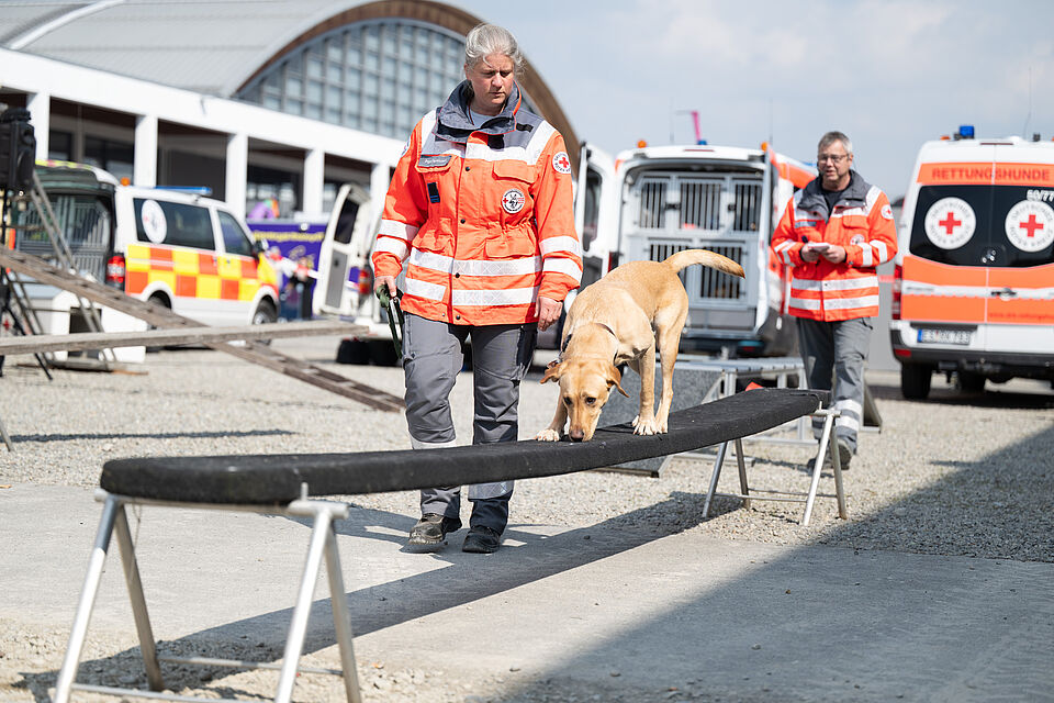 Am 20.03.2026 war es wieder soweit. Unsere größte Vorführung im Jahr auf der Internationalen Bodenseemesse in Friedrichshafen stand bevor. Bei dieser Messe nimmt unsere Bereitschaft traditionell auf Einladung der Messe Friedrichshafen seit Jahrzenten teil und zeigt am Wochenende zusammen mit den Kameraden der DRK Rettungshundebereitschaft Ravensburg das Können der Hunde. Logistisch ist dies durchaus ein Aufwand um alles Material und unsere Hunde dort hin- und unterzubekommen. Mit mehreren Dienstfahrzeugen, einem LKW und mehreren Anhängern ging es daher Freitags aufs Messegelände. Dort wurde dann fleißig unsere Standfläche im Freigelände aufgebaut und alles für das Wochenende vorbereitet. Neben vielen Vorführungen von unseren Hundeführern konnte man sich an unserem Infostand über die Rettungshundearbeit informieren. Natürlich kam an diesem Wochendende trotz wenig freier Zeit die Kameradschaft nicht zu kurz und jeder freute sich schon auf das Wiedersehen mit den Kameraden aus Ravensburg. Nach zwei stressigen, aber auch sehr schönen Vorführungstagen mit vielen leuchtenden Kinderaugen ging es am Sonntag ans Abbauen unseres Standes, alles wieder einpacken, verladen und dann nach einem gemeinsamen Abschied wieder zurück nach Hause. Der nächste IBO Termin steht schon im Kalender 2027 und wir freuen uns schon auf das nächste Jahr!